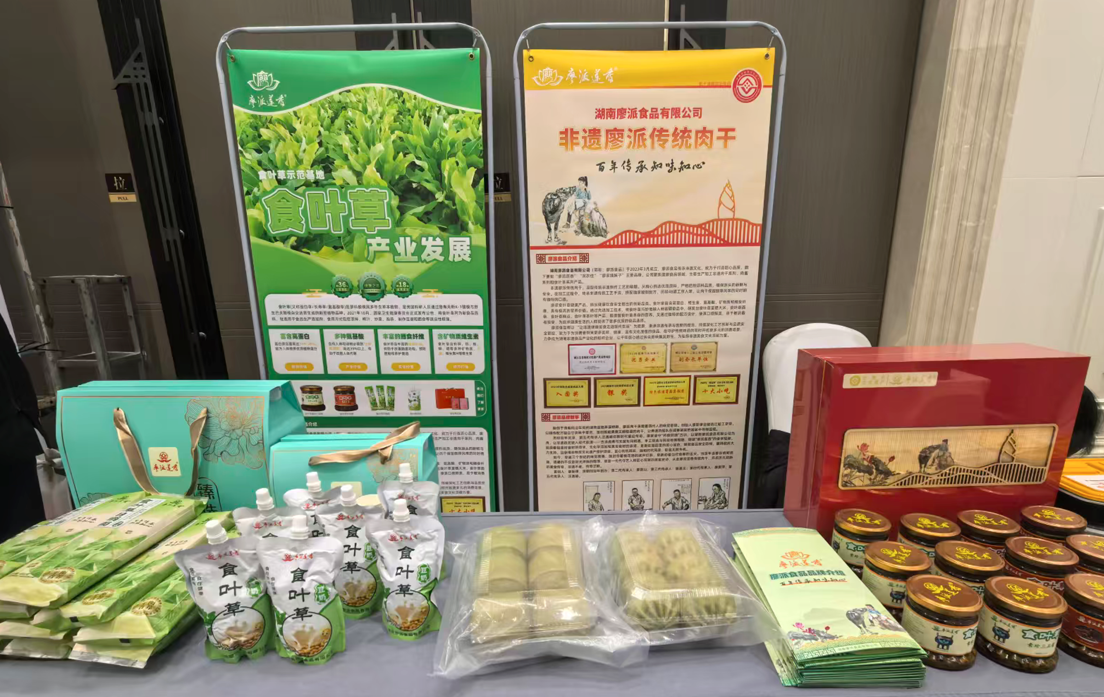 廖派莲香的展台更凭借独特的非遗气质与新食品类目,吸引了众多参会者驻足。其中,食叶草系列产品作为品牌重点布局的特色品类,成为现场焦点。展台不仅陈列了食叶草与非遗工艺结合研发产品,还与参会人员重点介绍了食叶草的产业价值——这种被称为“植物金矿”的多年生宿根植物,2021年已被批准为新食品原料,蛋白含量最高达48.7%,远超大豆,且富含18种氨基酸、多种膳食纤维、多种维生素及硒、钾等有益矿物质,兼具补充营养、促进消化的功效。现场食叶草日晒面、食叶草包子、食叶草馒头等系列产品,其清新口感与健康属性,让不少团餐企业代表驻足咨询合作。“我们希望借助大会平台,让食叶草这一优质食材与百年非遗工艺深度融合的成果走进团餐场景,为餐企提供兼具营养优势与文化附加值的解决方案。”团餐产业一头连着乡村食材供给,一头连着民生消费,这与廖派莲香“以非遗赋能特色品牌,以产业助力乡村振兴”的理念高度契合。
