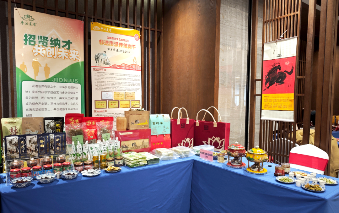 作为始创于清朝同治年间的非遗品牌,廖派莲香承载着四代人的味觉密码,如今在第五代传承人汪逸瑜的带领下,以湖南廖派食品有限公司为载体,让百年非遗技艺驶入现代航道。展台上,非遗肉干系列、传统肉酱系列、食叶草系列等新食品整齐陈列,古法卤煮与无菌车间的结合、手工筛选与科技检测的相融,契合现代消费者对健康食品的需求。“这款素珍三品酱还获得过中国特色旅游商品大赛入围奖呢!” 工作人员的介绍,让嘉宾们对桃江非遗产品的实力有了更直观的认识。